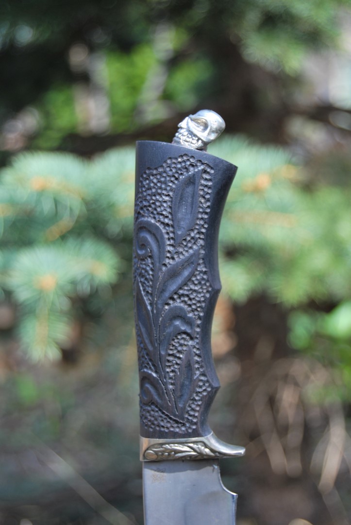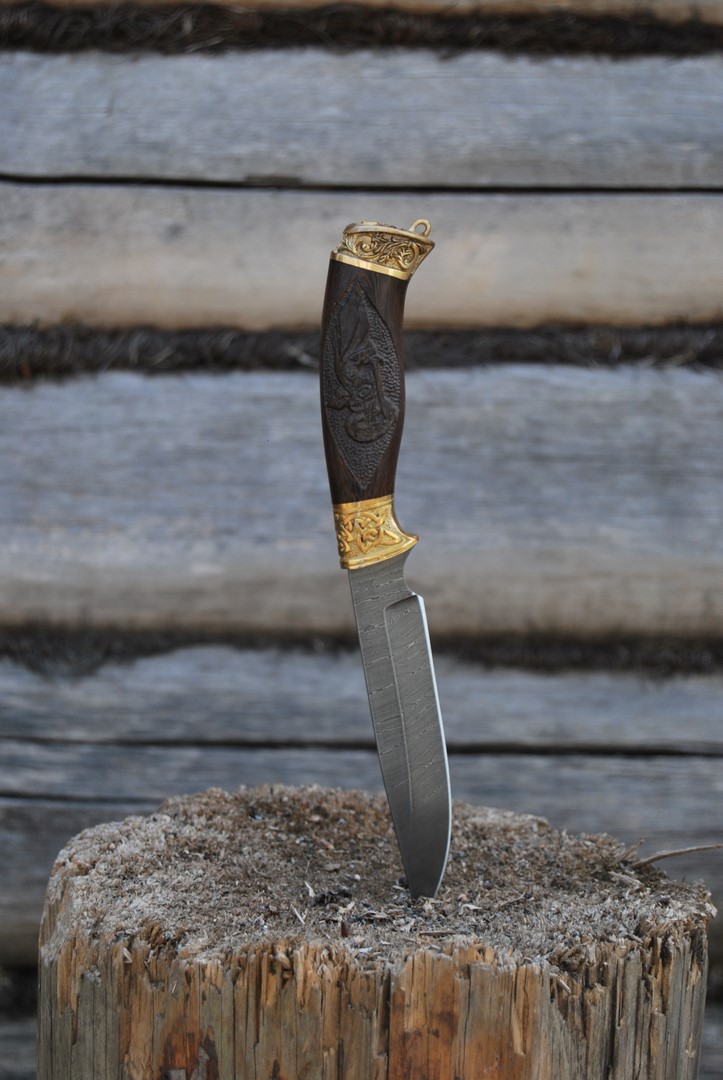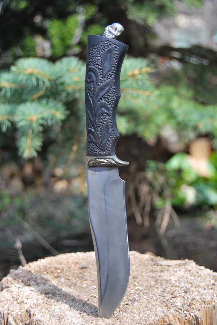Нож превосходно сбалансирован и «сидит» в руке. Рукоять выполнена из венге. Резьба на рукояти иллюстрирует русского витязя.