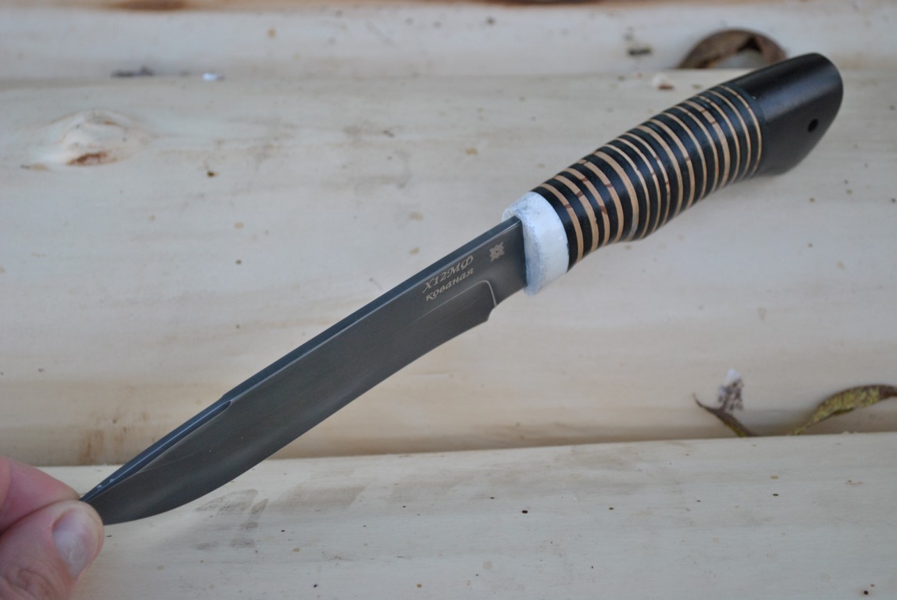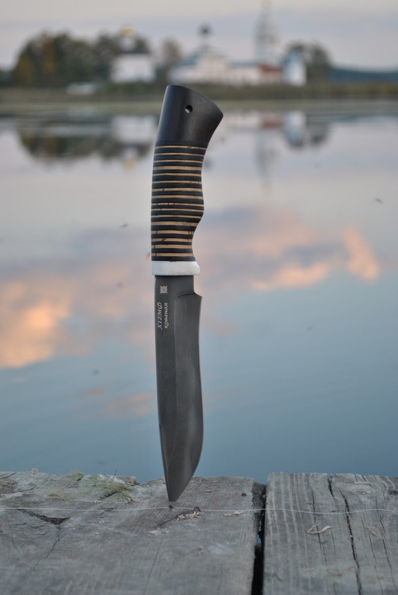 Продуманная эргономика рукояти, обеспечивает надежное и уверенное удержание ножа в различных условиях: голой рукой, в перчатке, мокрой рукой. Отдельно стоит обратить внимание на материал, из которого изготовлена рукоять. Больстер рукояти выполнен из натуральной кости. Черен рукояти выполнен наборным способом. В нем чередуются кожа и береста. Тыльная часть изготовлена из стабилизированной древесины венге. Тыльник рукояти имеет отверстие под темляк или подвес.