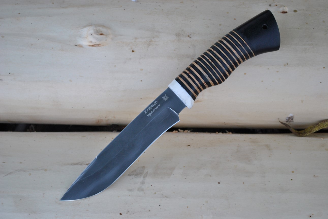 Клинок этой модели изготовлен из кованой стали Х12МФ, что обеспечивает ему максимальную твердость и надежность. Физические характеристики этой стали таковы, что многие производители часто преподносят ножи, изготовленные из нее в качестве ножей, изготовленных из булатной стали. Клинки, изготовленные из стали Х12МФ, действительно обладают большим сопротивлением на излом и скручивание. Если специально не задаваться целью, то сломать такой нож практически невозможно. Геометрия клинка позволяет его использовать как для силовой работы, так и для тонкой нарезки продуктов.