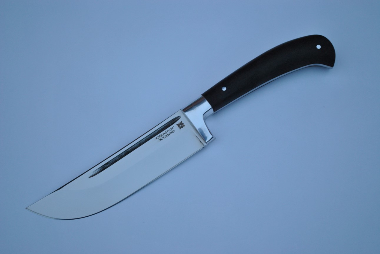 В давние времена, ножи в оhсновном изготавливали из железа с большим содержанием углерода, потому исторические клинки до нашего времени сохранились плохо. Обязательными атрибутами ножа пчака была рукоять, которая украшалась различными декоративными элементами, включая драгоценные камни. Сама рукоять изготавливалась из рога или камня. На клинке довольно часто мастера располагали высказывания из священных книг. Известны также модели аналогичных ножей, которые имели клинок из булата или дамасской стали. Стоит ли говорит, что позволить себе нож пчак из дамасской стали мог только обеспеченный человек - богатый купец или известный воин. Последние несколько лет популярность этих ножей среди охотников и туристов постепенно растет. Среди тех, кто не является сторонником любой аутдор активности, ножи пчаки также пользуются большой популярностью. Такой нож удобно иметь на кухне, на даче или в шашлычном наборе с которым вы ездите на пикник. Причиной тому отличные рабочие качества этого ножа. Компания «Сварог» производит и продает несколько моделей узбекских ножей пчаков. Ножи изготавливаются из различных сталей и имеют рукояти из натурального дерева. В этом материале мы хотим познакомить вас с самыми популярными моделями ножей пчаков и рассказать об их конструктивных особенностях. Все ножи в этой сери носят название «Бахарман». Клинки ножей Бахарман изготавливаются из кованой дамасской стали и кованой стали Х12МФ. Узбекские ножи пчаки из дамасской стали имеют красивый рисунок на клинке, что, несомненно повышает ценность этого ножа и делает его отличным ножом для тех, кто помимо функционала ценит и внешнюю привлекательность ножа.