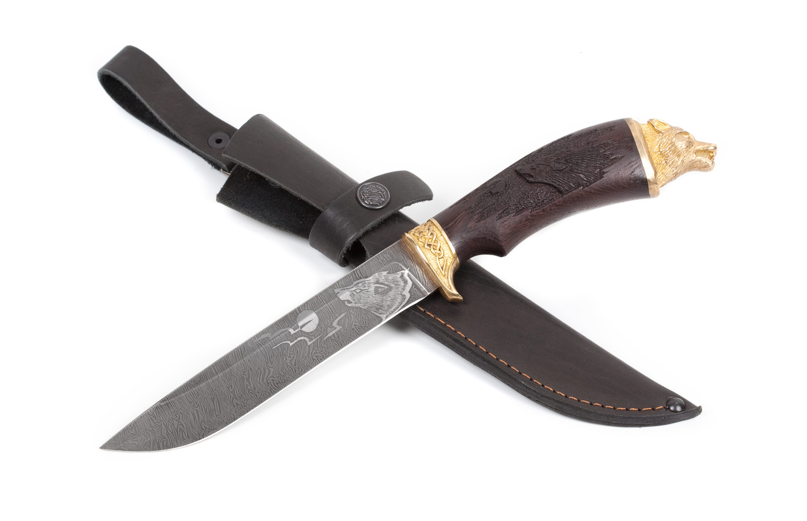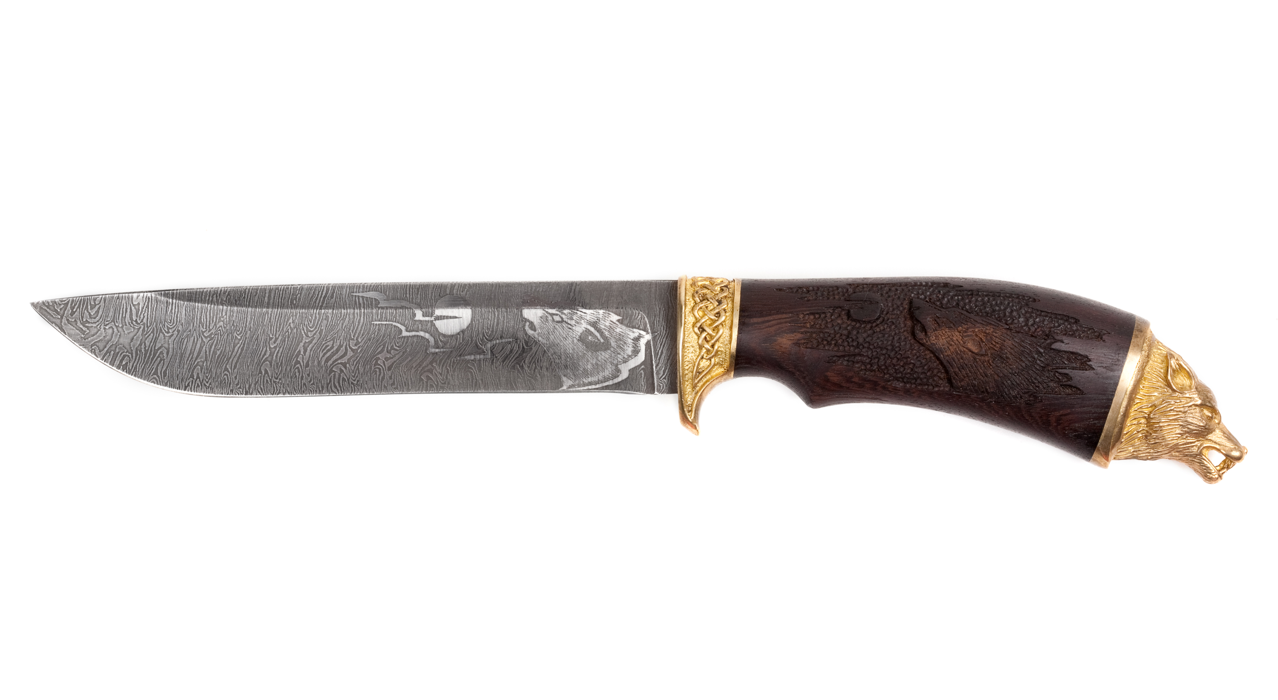 Изображение на клинке понравится активным и независимым людям, которые привыкли все решения принимать самостоятельно и всегда берут ответственность на себя. Черен рукояти изготовлен из дерева венге, которое имеет благородный коричневый цвет. На рукоять нанесена резной узор, на котором мы также видим волка и луну, которая прячется в облаках. Гарда и навершие выполнены из латуни. На гарде расположен рунический узор, которым традиционно украшаются русские охотничьи ножи. Навершие в форме головы волка дополняет картинку. Волк, который изображен на навершии, оскалил зубы и приготовился к атаке.