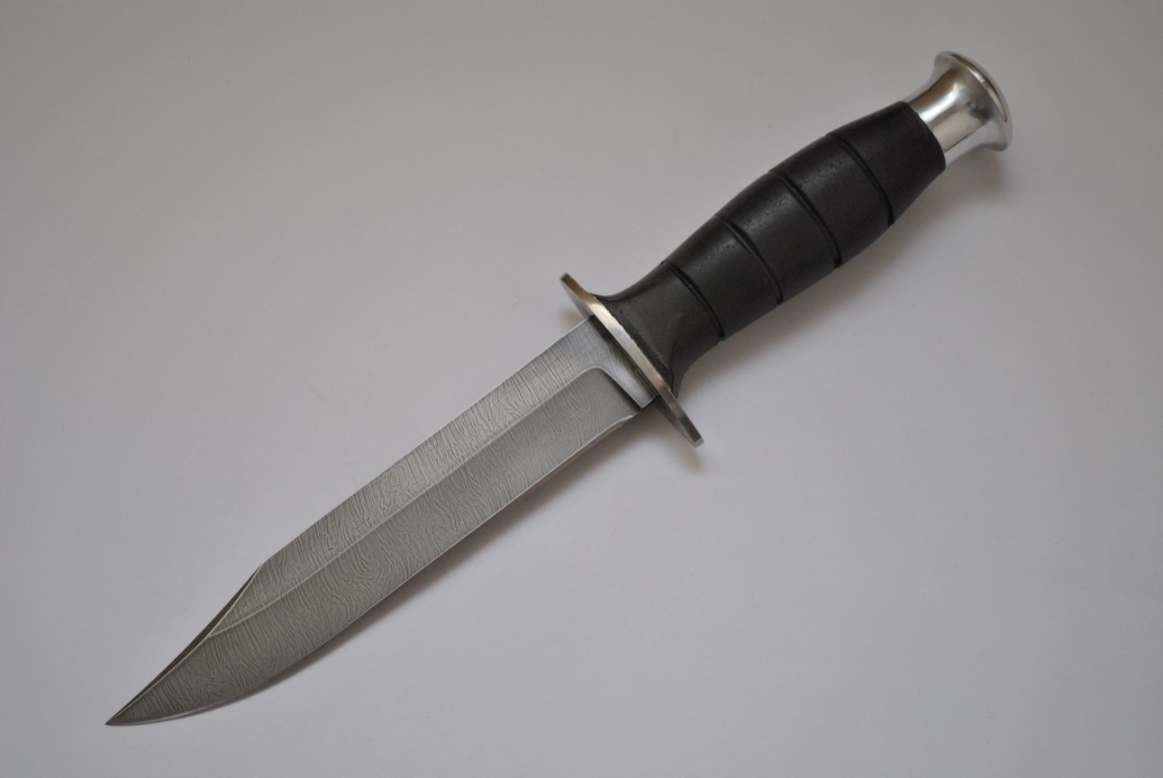 Если посмотреть на фотографии солдат, которые побывали в Афганистане, то у многих можно увидеть именно этот нож. К отличительным признакам этой модели относится симметричная рукоять с металлическим навершием. Рукоять ножа изготовлена из плотной резины, которая заливается в форму под давлением. Такую рукоять удобно удерживать голой рукой. Даже если рука вспотела («рука бойцов колоть устала…»), нож не выскальзывает из нее. Если в преддверии знаменательного праздника Дня Победы, вы решили купить нож из дамасской стали, то в соответствующем разделе нашего сайта вы найдете большое количество охотничьих ножей из дамасской стали.