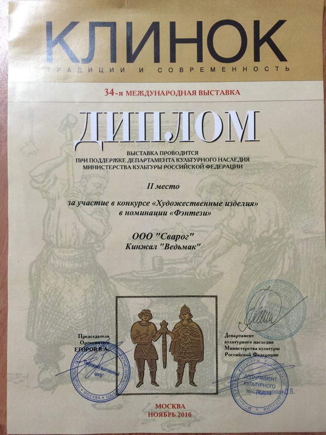 На 34-ой международной выставке «Клинок» (ноябрь 2016 г. ) нож из дамасской стали Компании Сварог занял второе место в конкурсе «Художественные изделия» в номинации «Фэнтези».