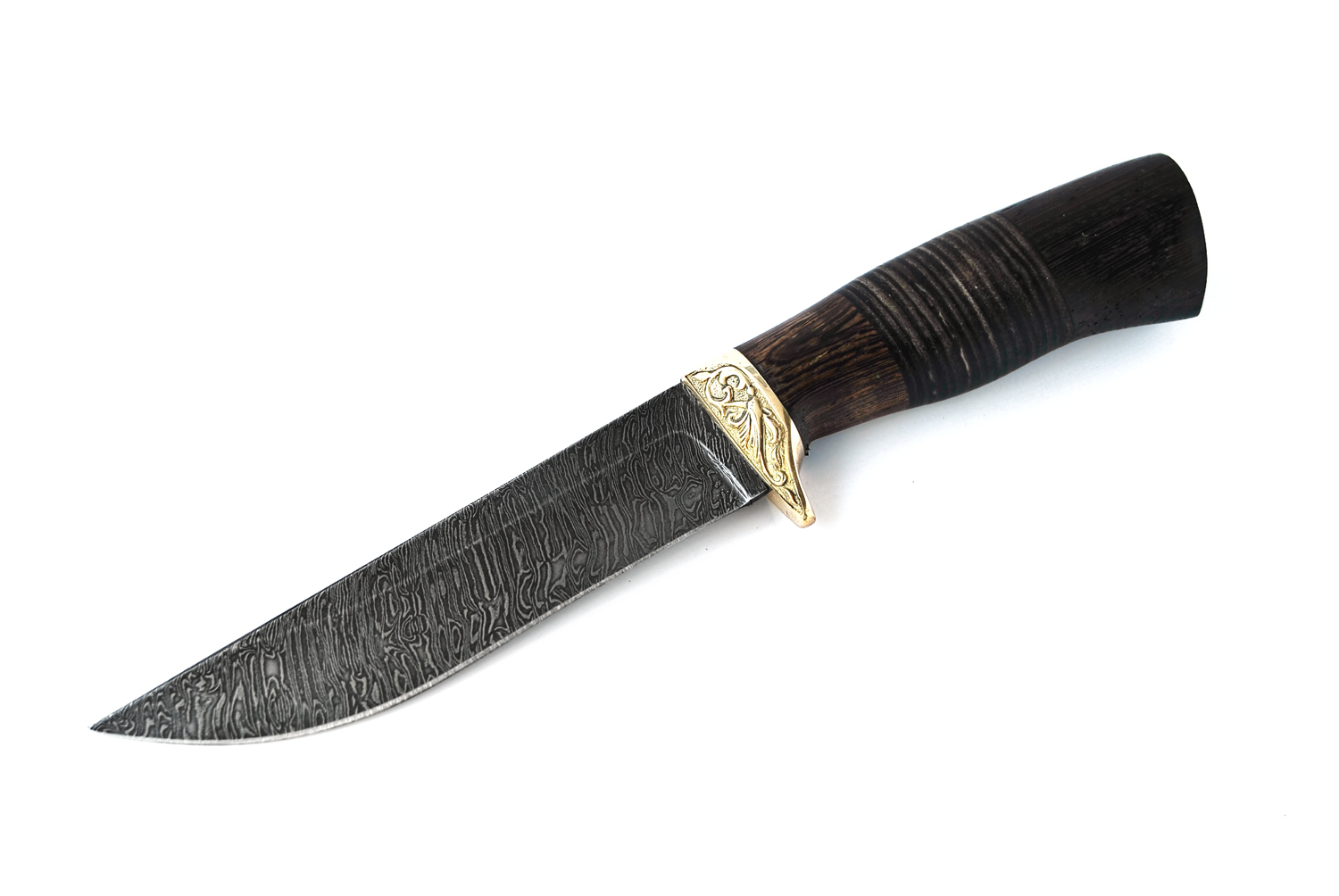 Клинок из дамасской стали позволяет использовать нож в любых климатических условиях: от тропических лесов на юге, до полярной тундры на севере. Дамаск легко переносит резкие перепады температуры, так как у него нет однородной кристаллической решетки. Рукоять данной модели представляет собой интересное решение. Средня часть выполнена из наборной кожи, что обеспечивает комфортное удержание ножа и гасит вибрации при сильных ударах. Тыльник из твердого дерева венге обеспечивает жесткость всей конструкции. Оковка из латуни имеет стильный вид, но выполняет не только декоративную функцию. Оковка имеет выступ, который защищает пальцы от соскальзывания на клинок. Нож комплектуется чехлом из высококачественной натуральной кожи с петлей для свободного подвеса. Фиксация ножа происходит с помощью надежной стальной кнопки.