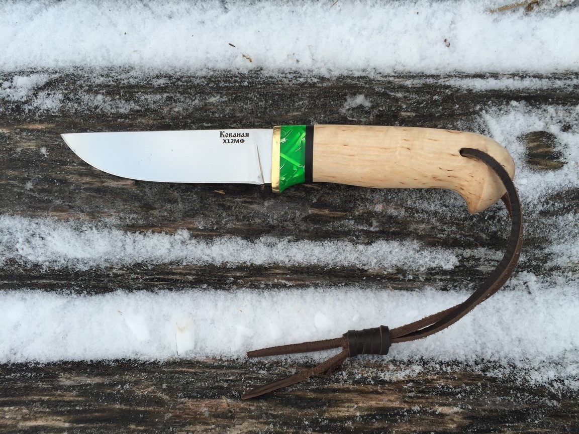 Нож оснащается кожаным темляком, который помимо декоративной выполняет страховочную функцию. Эта опция пригодится при работе над водой или над глубоким снежным покровом. Если вы хоть раз пытались найти нож, который упал в глубокий снег, скорее всего вы понимаете о чем мы говорим. Нож имеет стильную внешность, что позволяет использовать его в качестве подарка. Приятным дополнением является болстер из цветного акрилового композита. Если вы планируете купить охотничий нож, мы рекомендуем обратить внимание на эту модель. Высокие спуски позволяют легко довести режущую кромку до бритвенной остроты. Кованая сталь Х12МФ обладает высокой твердостью, что обеспечивает сохранность рабочих характеристик в течение длительного времени.