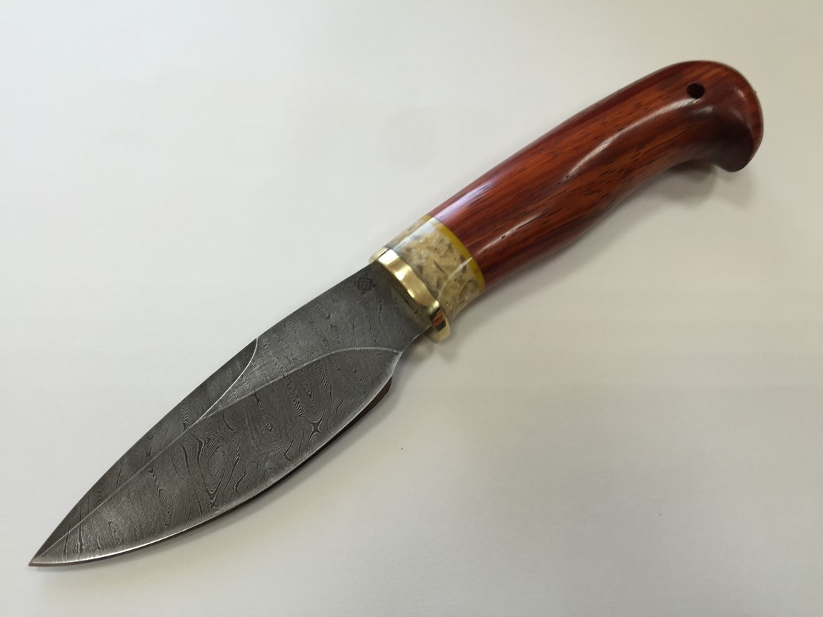 И наконец, нужная форма нашлась — клинок ножа представляет собой нечто среднее между коротким восточным кинжалом и копьем африканского воина. На первый взгляд, такое решение может показаться спорным, но поверьте, стоит взять нож в руку и все сразу встает на свои места. Короткий и мощный клинок имеет острый кончик, схождение граней на клинке обеспечивает высокий запас прочности. Чтобы сделать внешность ножа еще более уникальной, мы использовали для этой модели материалы преимум-сегмента: дамасскую сталь и древесину африканского красного дерева. Клинок из дамасской стали имеет глубокий рисунок из переплетающихся линий, что отлично сочетается с природной текстурой дерева падук.