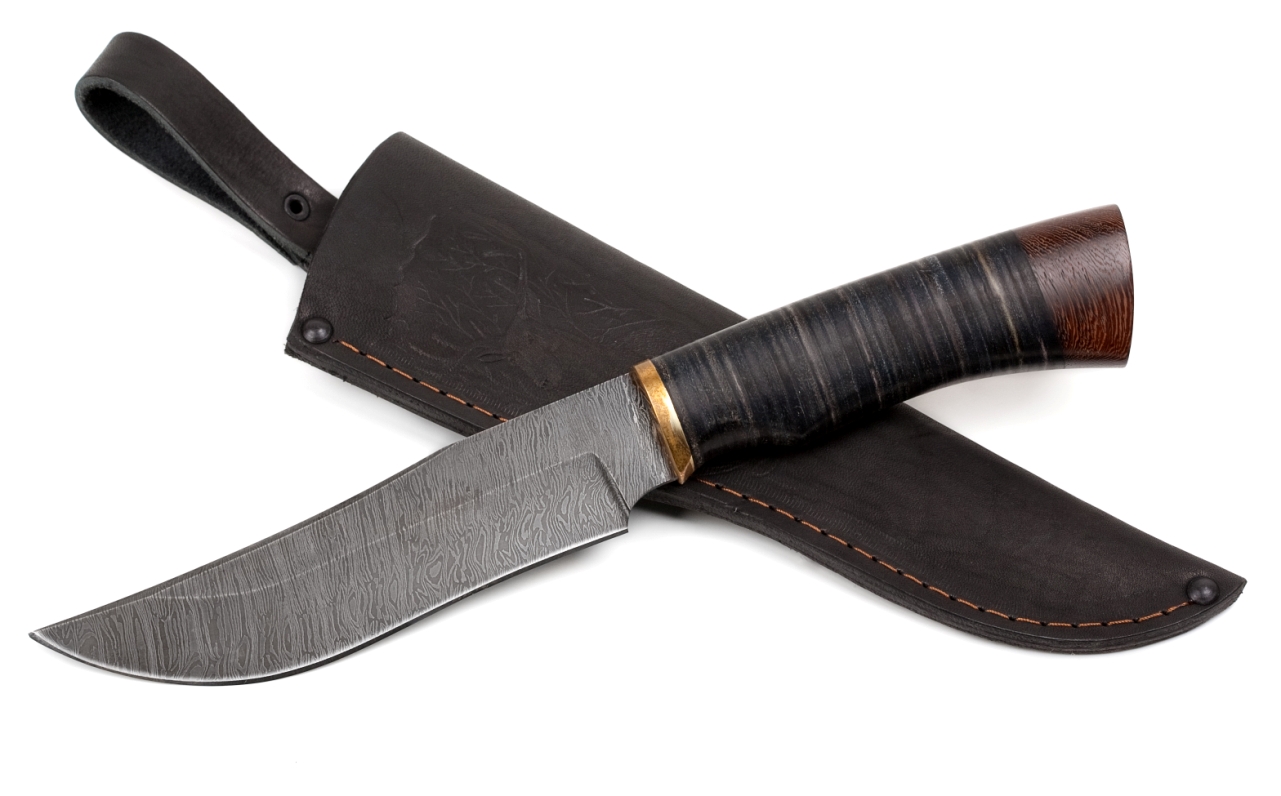 Наш «бухарский» нож из дамасской стали, тоже обладает большим и широким клинком. Длинное лезвие, сужающееся к концу, немного напоминает форму ятагана. Длина клинка составляет 160 мм, длина рукояти 135 мм. Рукоять ножа выполнена из наборной кожи, притина латунь, пятка – дерево Венге. Нож из дамасской стали «Бухарский» довольно массивный и большой нож.