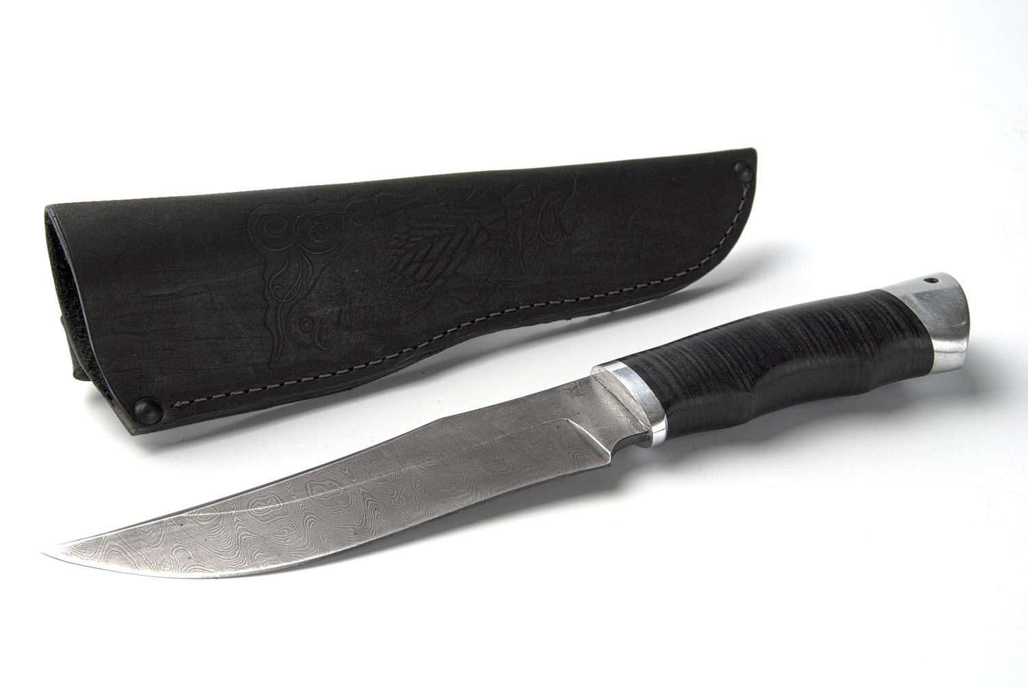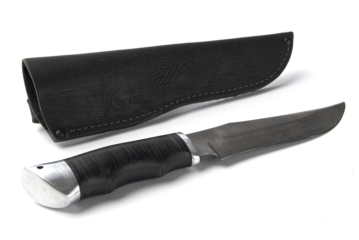 Ранее мы уже упоминали о нем на страницах нашего сайта. Сейчас представляем еще один нож из дамасской стали. Рукоять ножа полностью выполнена из наборной кожи и имеет навершие из дюрали. В пятке предусмотрено отверстие под темляк. Рукоять имеет удобную эргономичную форму, благодаря которой нож из дамасской стали надежно фиксируется и сидит в ладони.
