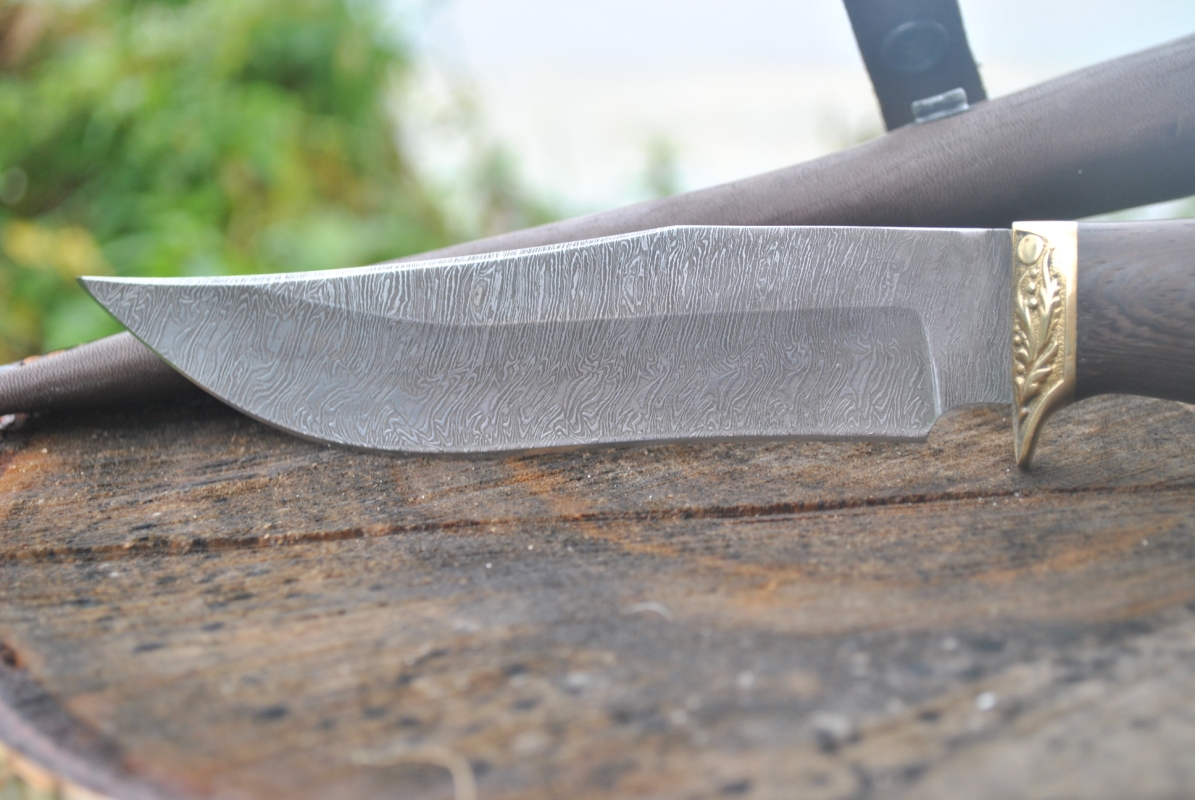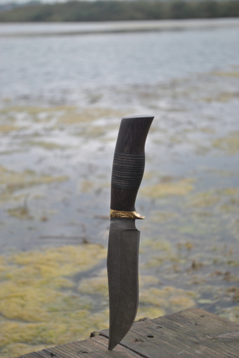 Форма рукояти позволяет надежно нож зафиксировать в руке. Что еще необходимо отметить, что нож из дамасской стали имеет относительно небольшой вес, не смотря на размеры клинка. Толщина обуха данной модели составляет 2,3 мм. Рукоять – дерево Венге, посередине вставка из кожи.
