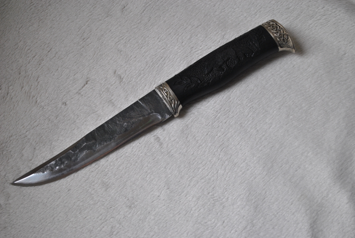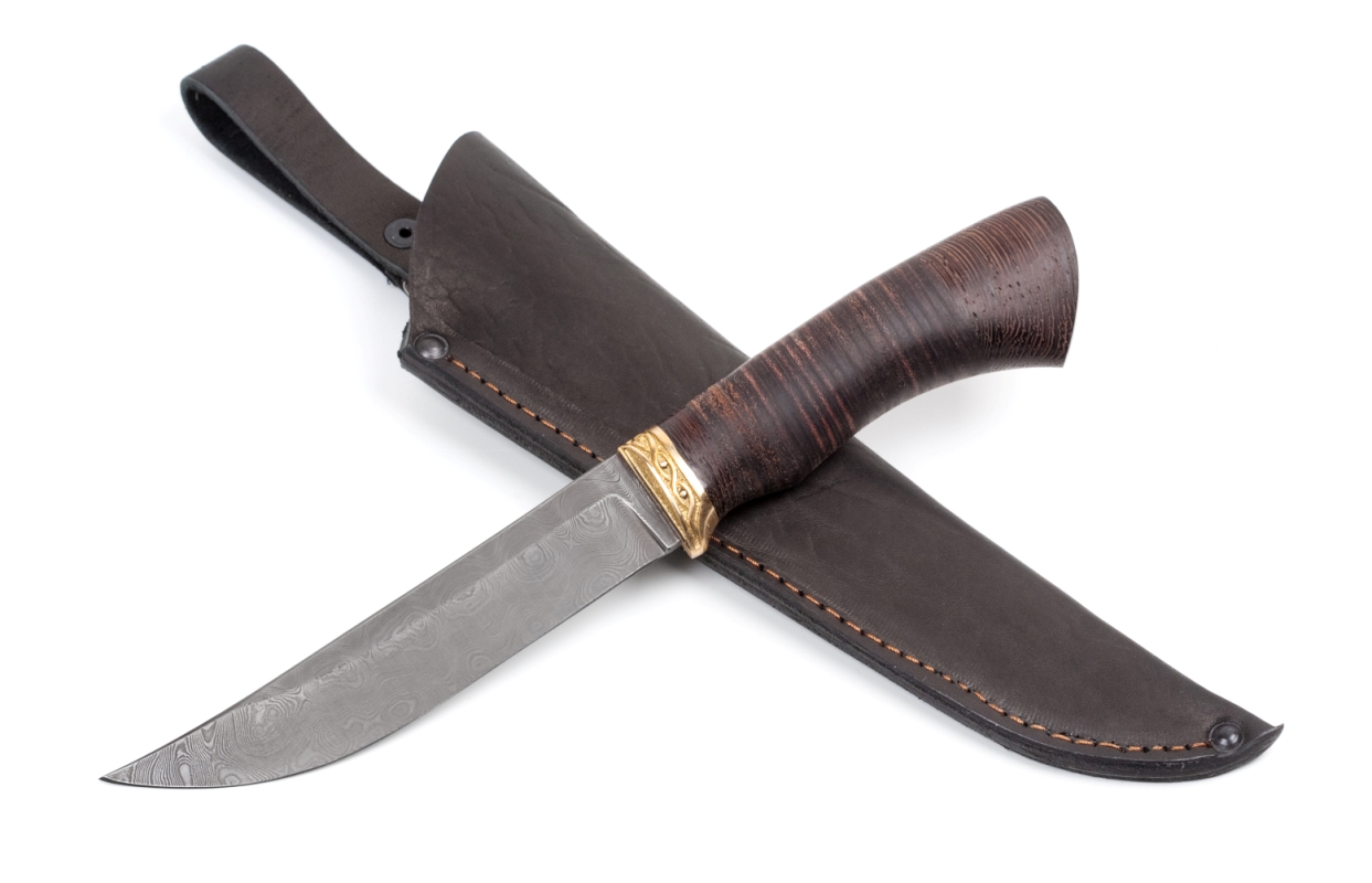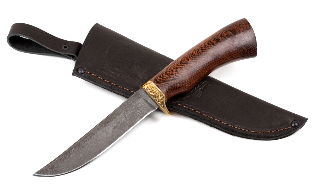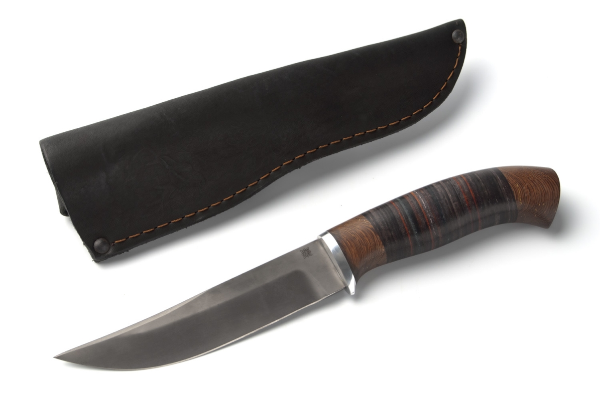 Рукоять этого ножа выполнена из наборной кожи и дерева Венге. Одним из главных свойств ножа, важных для профессионального охотника, является то, что им удобно обдирать шкуру. Режущая кромка увеличивает длину реза, а саблевидная форма упрощает движение рукой при работе. Так же, Вы можете купить охотничий нож «Лань» из стали Х12МФ с элементами ручной ковки.