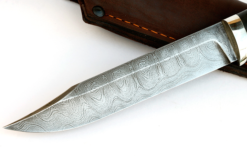 Клинки очень похожи. В качестве материала клинка, в данном случае, использовали дамасскую сталь. Клинок имеет толщину обуха порядка 3,5 мм. Это надежный, массивный клинок, которым можно не только что-то порезать, но и при желании, порубить, что имеет не маловажное значение на охоте.