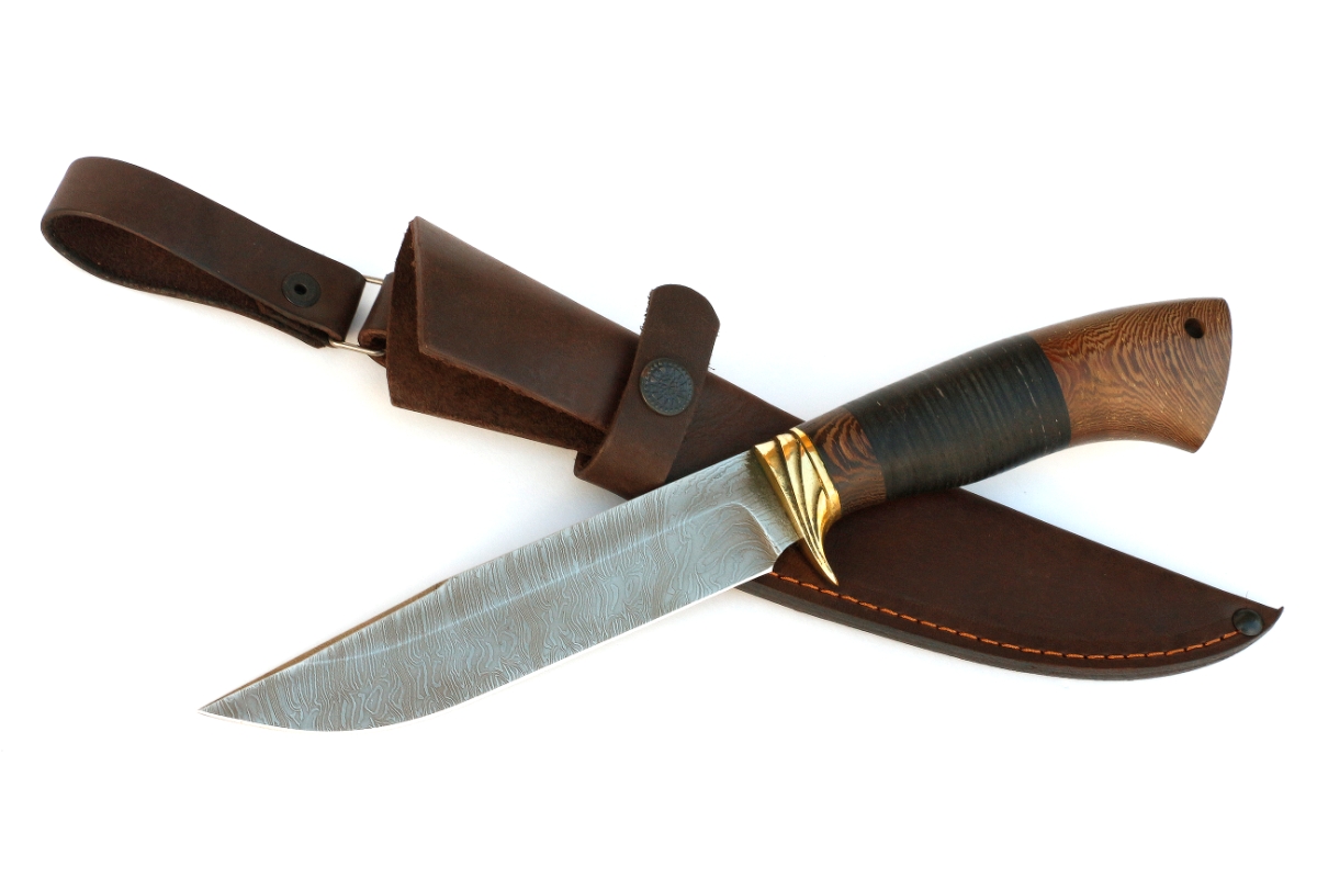 Рукоятка, для удобства охотника снабженная темляком, выполнена из дерева Венге и кожи. Охотничий нож надежно и крепко «сидит» в руке, пятка чуть загнутая к низу обеспечивает необходимую фиксацию при работе с ножом. Ножи из дамасской стали «Коршун», «Витязь», «Бухарский», «Лиса» воплотили в себе пожелания охотников, которым необходим эргономичный и функциональный рабочий охотничий нож.